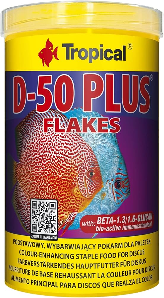 Τροφή με νιφάδες που ενισχύουν το χρώμα με υψηλή περιεκτικότητα σε πρωτεΐνες (50%), που προορίζονται για την καθημερινή σίτιση δίσκων και άλλων ψαριών με υψηλές διατροφικές ανάγκες. Η εξαιρετική θρεπτική του αξία καθιστά το D-50 PLUS μια τέλεια λύση διατροφής για ζευγάρια ωοτοκίας και νεαρά ψάρια. Το καλαμάρι (8%) και το κριλ (3%) κάνουν το φαγητό πολύ εύγευστο και παρέχουν την πηγή εύπεπτης πρωτεΐνης, πλούσιας σε απαραίτητα αμινοξέα. Η υψηλή περιεκτικότητα σε φυσική ασταξανθίνη εγγυάται φωτεινό και ζωντανό χρωματισμό. ...Περισσότερα