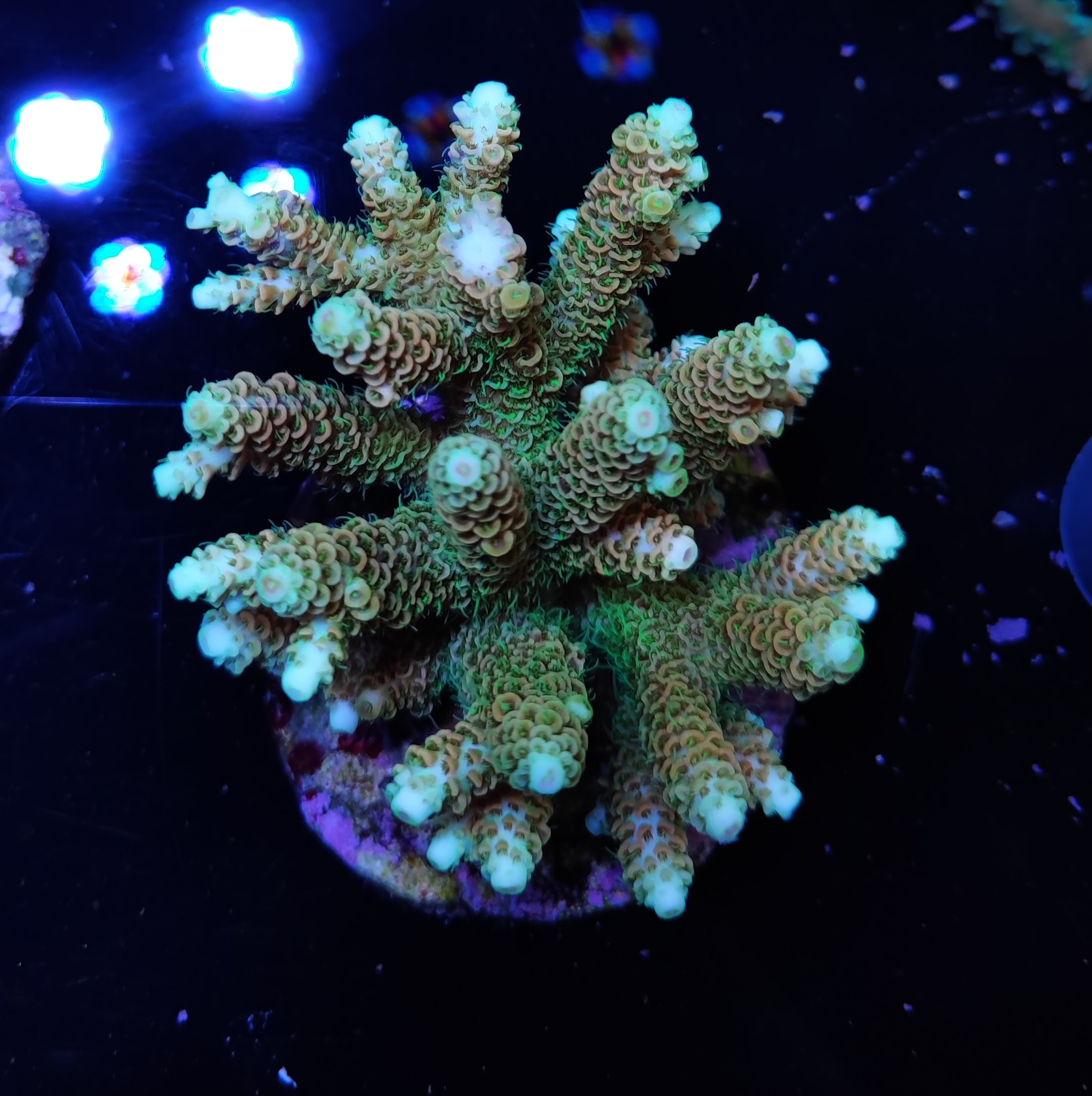 Acropora millepora Rainbow is one of the most striking forms of the Acropora millepora species, known for its colorful appearance that includes shades of pink, blue, green, purple and yellow. It belongs to the SPS (Small Polyp Stony coral) category and is considered a premium choice for advanced aquarists who maintain stable parameters in reef aquariums.