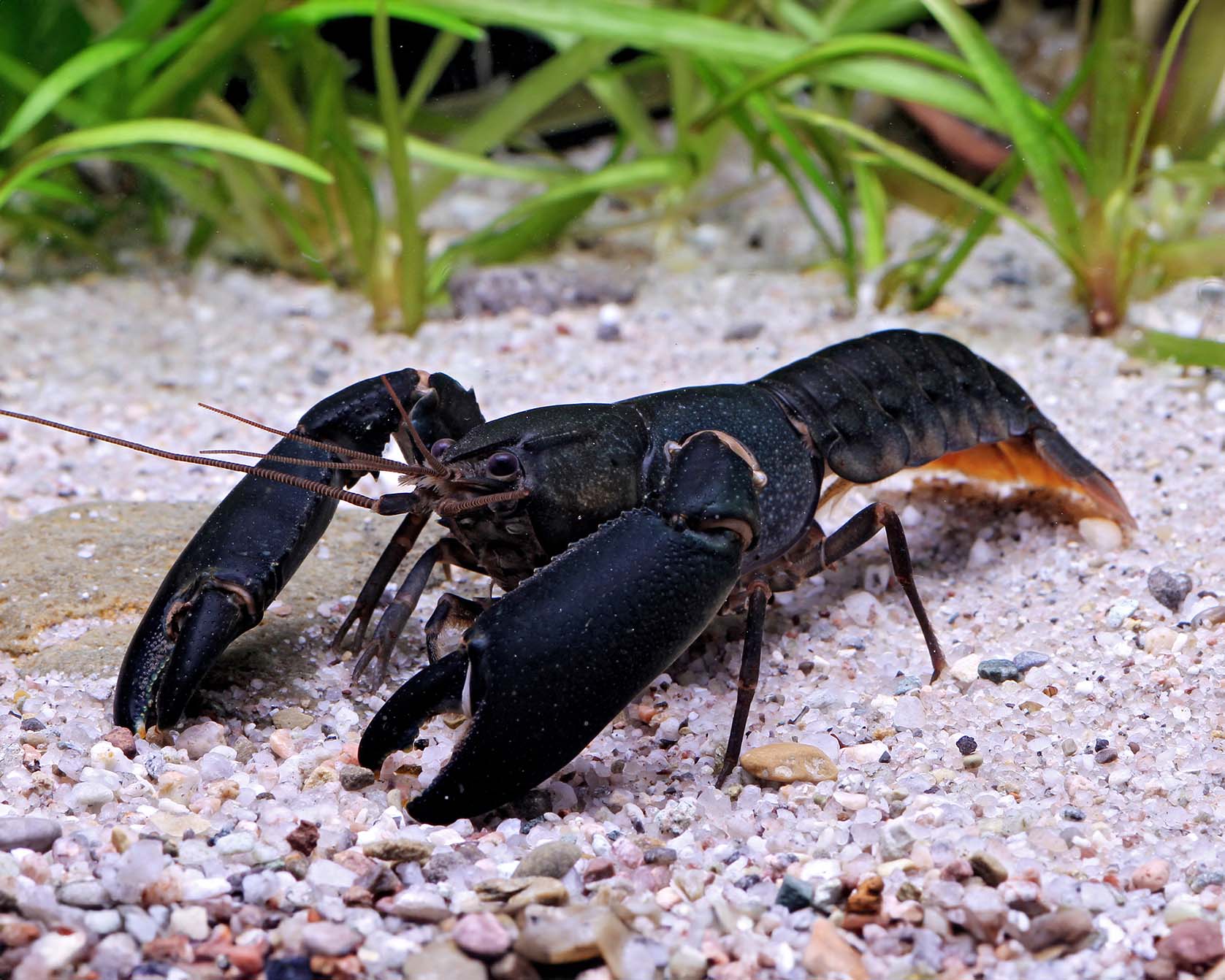 Color: Deep black or very dark blue/purple body, often with strong contrast on the extremities or claws. The color can change depending on the diet, stress and water conditions.
