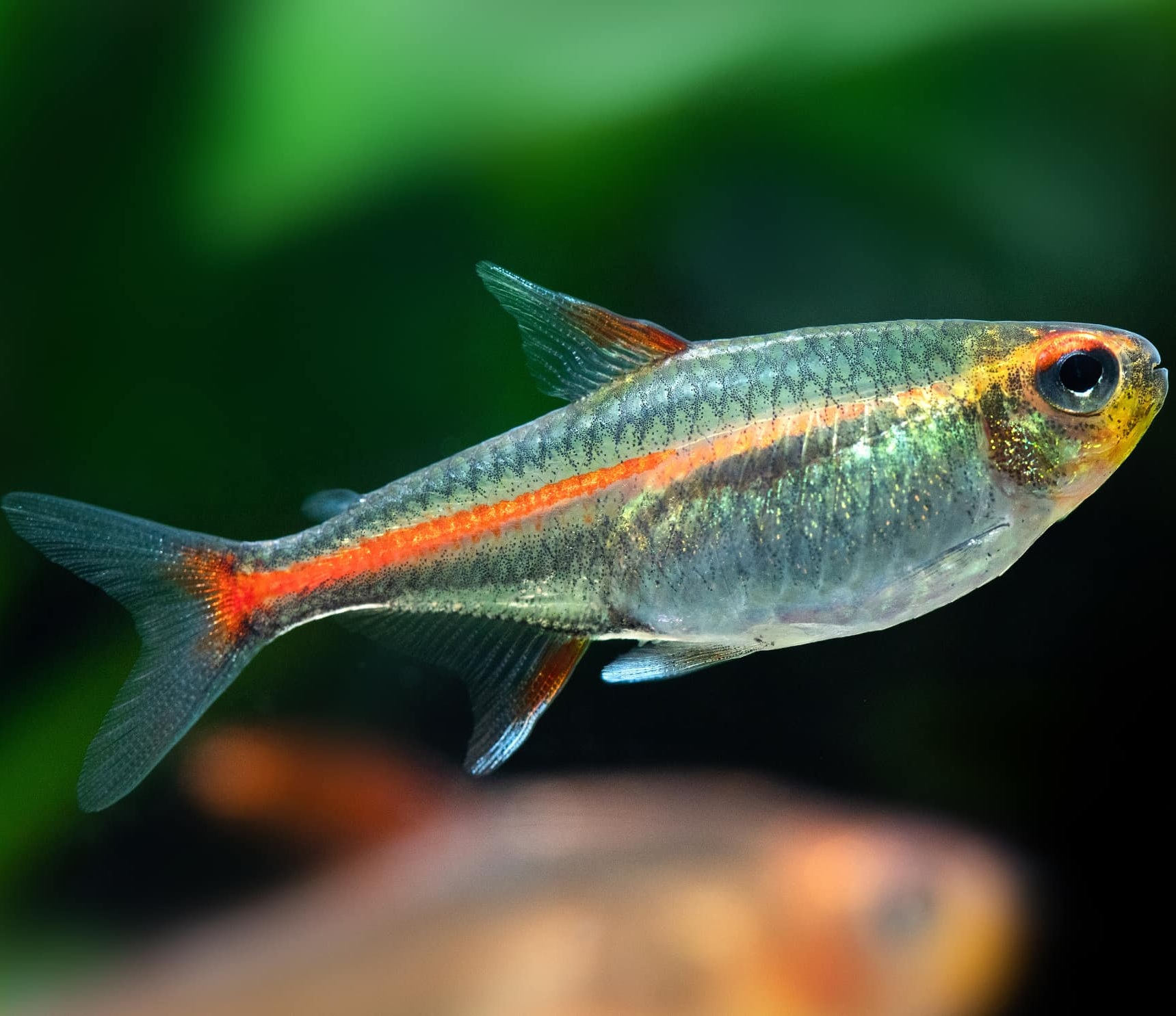 Appearance: transparent to silver body with a striking orange-red luminous line that starts from the eye and ends at the tail.
