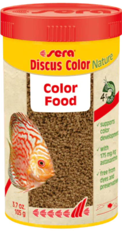 sera Discus Color Nature is the colour-enhancing food without dyes and preservatives, which consists of carefully formulated soft granules. Suitable for all Discs. The balanced combination of color enhancers, such as natural Haematococcus algae astaxanthin (175mg/kg feed), Spirulina and krill, enhances color development in a targeted and natural way. Disease resistance, healthy growth, and fertility are enhanced through highly digestible, water-based proteins, omega fatty acids, minerals, and trace elements. their shape. The water is therefore not contaminated. ...More