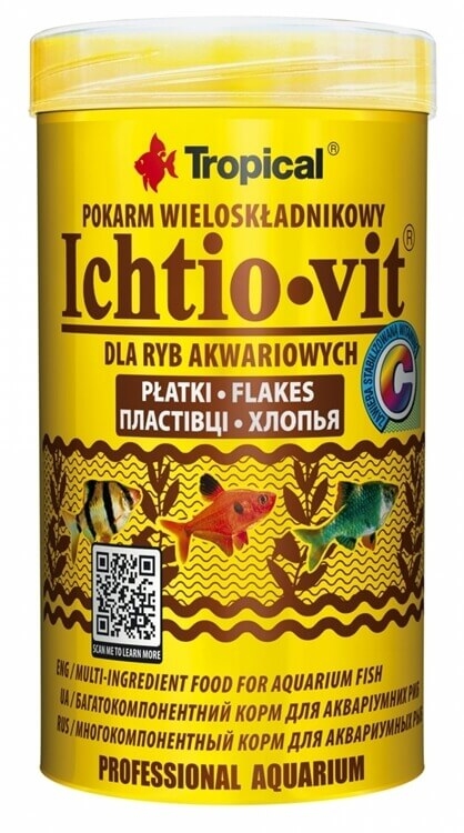 ICHTIO-VIT is a general flake food that proves to be particularly useful in multi-species tanks. It can be used for the daily feeding of the most popular omnivorous fish. It is prepared from carefully selected ingredients of plant and animal origin. Due to the balanced set of vitamins and minerals, it ensures the proper growth and development of fish, if used regularly. Another ingredient worth noting is a stabilized vitamin C, which strengthens the fish's immune system and speeds up wound and abrasion healing. ...More